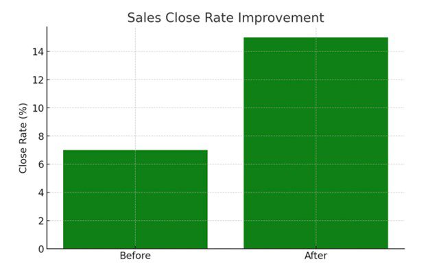 - Close Rate Improvement: We worked closely with the sales team to refine their approach, focusing on lead management, setting up a sales strategy that included activity management, and providing coaching and development through weekly meetings and one-on-one sessions. This comprehensive approach led to a substantial improvement in the close rate from 7% to 15%.